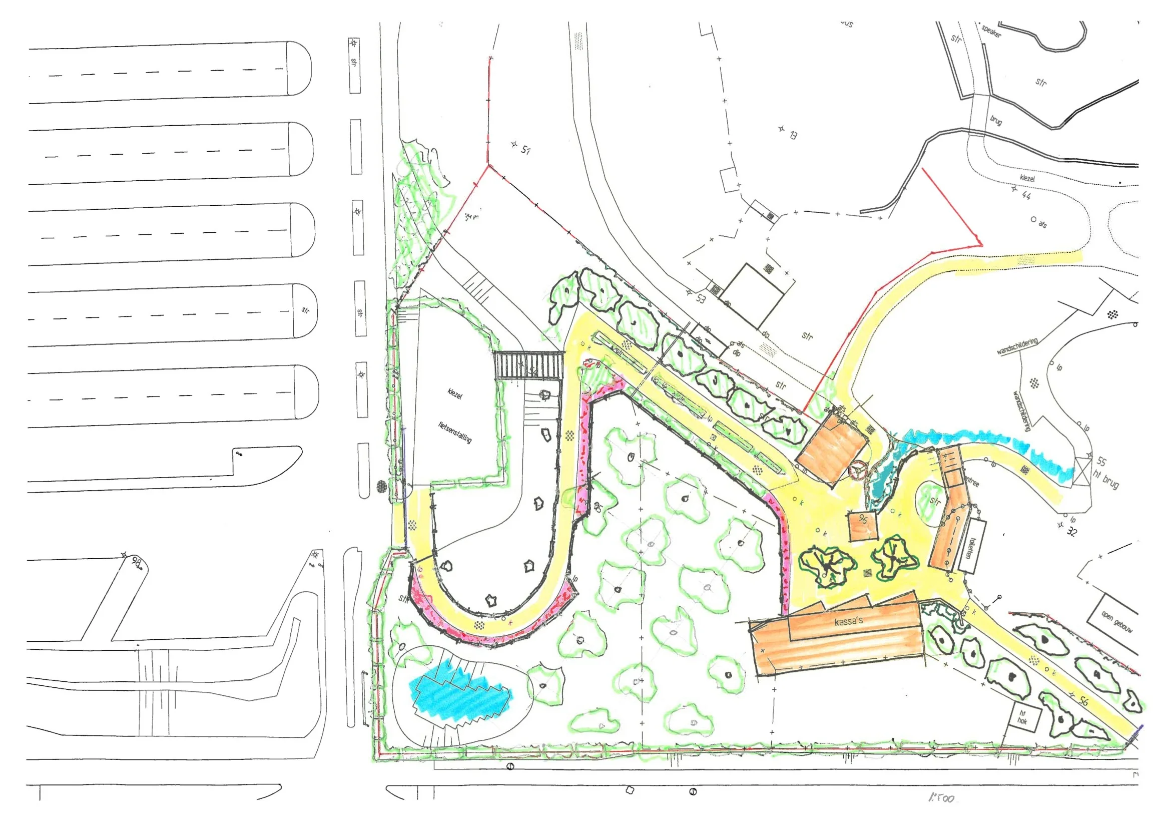 Als aanvulling de schets van nieuwe kassaplein: belangrijke veradering is dus dat we vanaf de parking het Zuid-Limburg gevoel gaan inbrengen: ipv lelijke pad nu gaan we een grote hoogstamfruitweide maken met Limburgs vee. Tussen pad en weide komen stroken met klaprozen, korenbloemen etc. In het talud links van het pad gaan we proberen een druivenrank-helling te maken (ism Rolduc) en hiertussen komen boombeelden met Limburgse dieren (uitgehouwen in Linden die we volgende week in park gaan kappen). De sfeer van de gebouwen op het plein moeten het geheel vervolmaken.